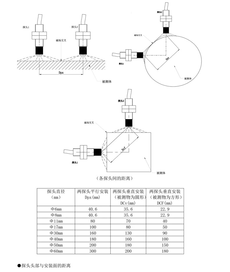 當(dāng)探頭頭部線圈中通過(guò)電流時(shí),在頭部周圍會(huì)產(chǎn)生交變磁場(chǎng),因此在安裝時(shí)要注意兩個(gè)探頭的安裝距離不能太近,否則兩探頭之間會(huì)通過(guò)磁場(chǎng)互相干擾(如下圖各探頭間的距離所示),在輸出信號(hào)上迭加兩探頭的差頻信號(hào),造成測(cè)量結(jié)果的失真,這種情況我們稱之為相鄰干擾。排除相鄰干擾有關(guān)的因素:被測(cè)體的形狀,探頭的頭部直徑以及安裝式。通常情況下探頭之間的zui小距離見下表。