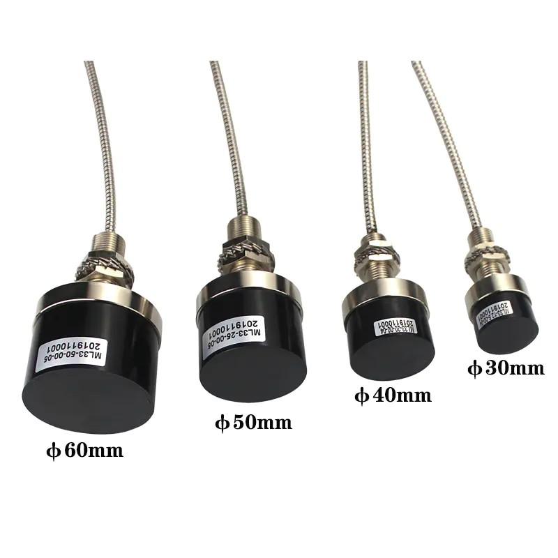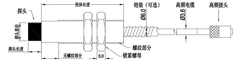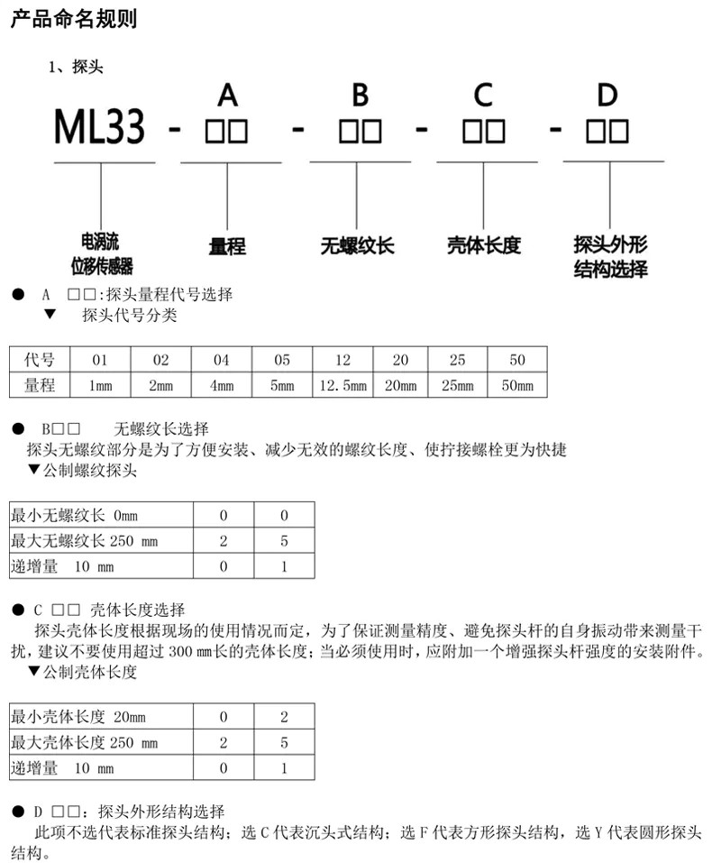 在制作過(guò)程中,探頭頭部體一般采用耐高溫PPS工程塑料,通過(guò)“二次注塑”成型將線圈密封其中。使探頭在惡劣的環(huán)境中能可靠工作。由于頭部體線圈直徑?jīng)Q定傳感器系統(tǒng)的線性量程,因此我們通常用頭部體外部直徑來(lái)分類和表征各型號(hào)探頭,一般情況下傳感器系統(tǒng)的線性量程大致是探頭頭部直徑的1/2~1/4倍。ML33系列傳感器探頭見圖所示(標(biāo)準(zhǔn)型):