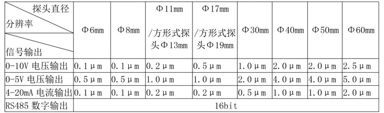 測(cè)量量程 | 1mm | 2mm | 4mm | 5mm | 12.5mm | 20mm | 25mm | 50mm |