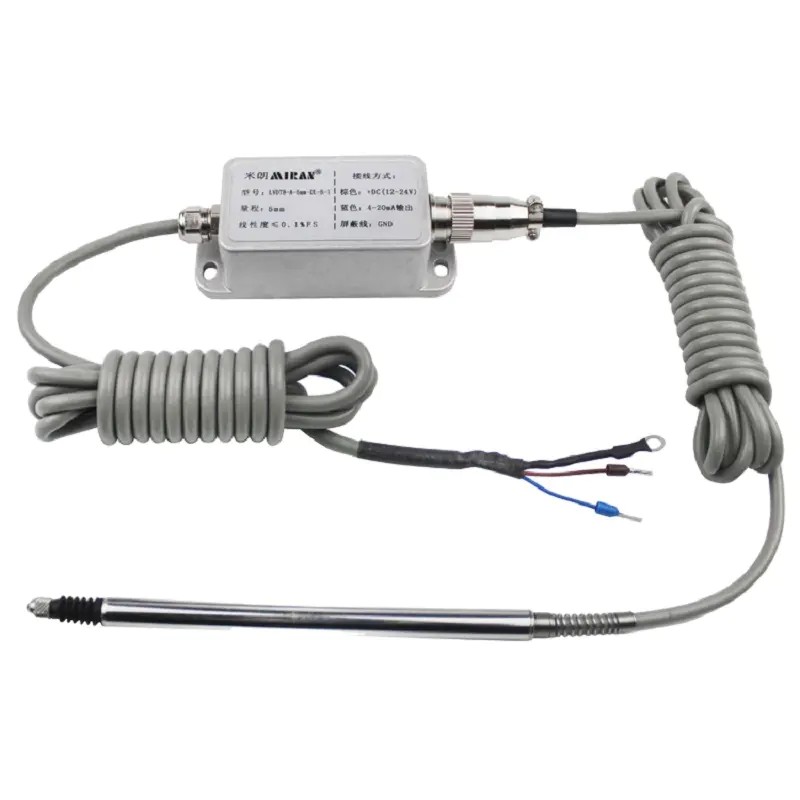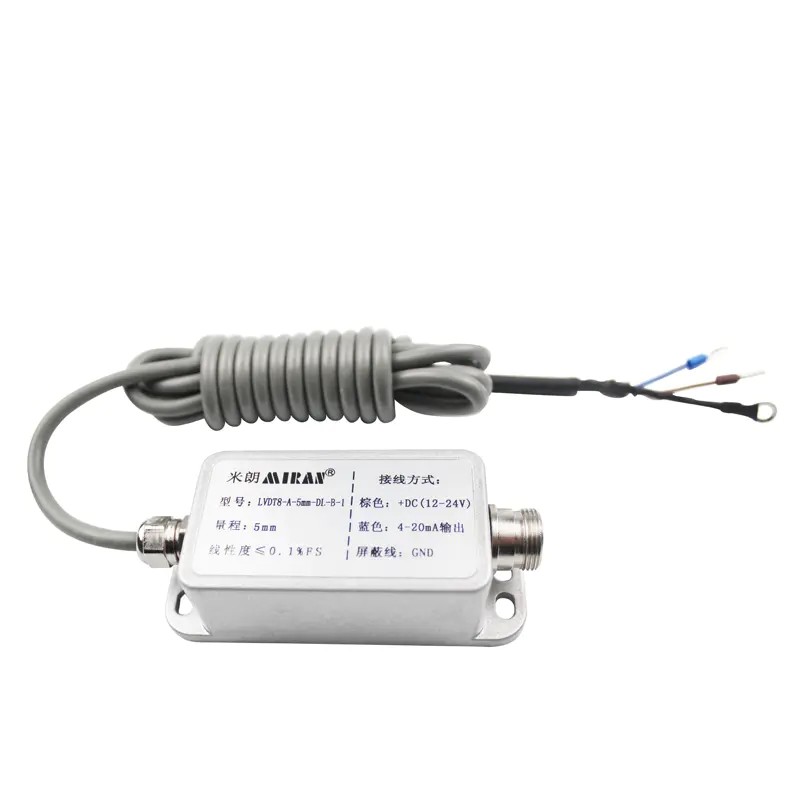 LVDT8筆式位移傳感器具有優良的性能,適用于質量控制和計量應用中的高精度,高重復性的測量。測頭采用高硬度的耐磨材料氮化硅陶瓷,測軸移動部分采用精密導軌。筆形位移傳感器外配變送器可輸出標準的直流信號,采用方便的單電源+12~30V DC供電,電子電路密封在304不銹鋼金屬管內,可以在潮濕和灰塵等惡劣環境中工作。輸出信號為標準的可被計算機或PLC使用的0-5V,0-10V,4-20mA或RS485輸出。
