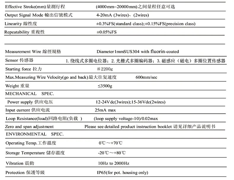 MPS-L拉線編碼器,又稱拉繩編碼器,拉繩尺,拉線尺,拉繩位移傳感器,拉線位移傳感器,是直線位移傳感器在結(jié)構(gòu)上的精巧集成,充分結(jié)合了角度傳感器和直線位移傳感器的優(yōu)點(diǎn),成為一款結(jié)構(gòu)緊湊、測量行程長、安裝空間尺寸小、具有高精度測量的優(yōu)良傳感器。MPS-L拉線編碼器系列產(chǎn)品具有很大的選擇空間,行程從200mm至20000mm不等, 具有模擬電流信號(hào)mA:4-20mA,模擬電壓信號(hào)V1:0-5V,V2:0-10V和脈沖信號(hào)P:A、B、Z相數(shù)字輸出,RS485數(shù)字信號(hào)輸出。滿足大行程、高精度各種信號(hào)需求。