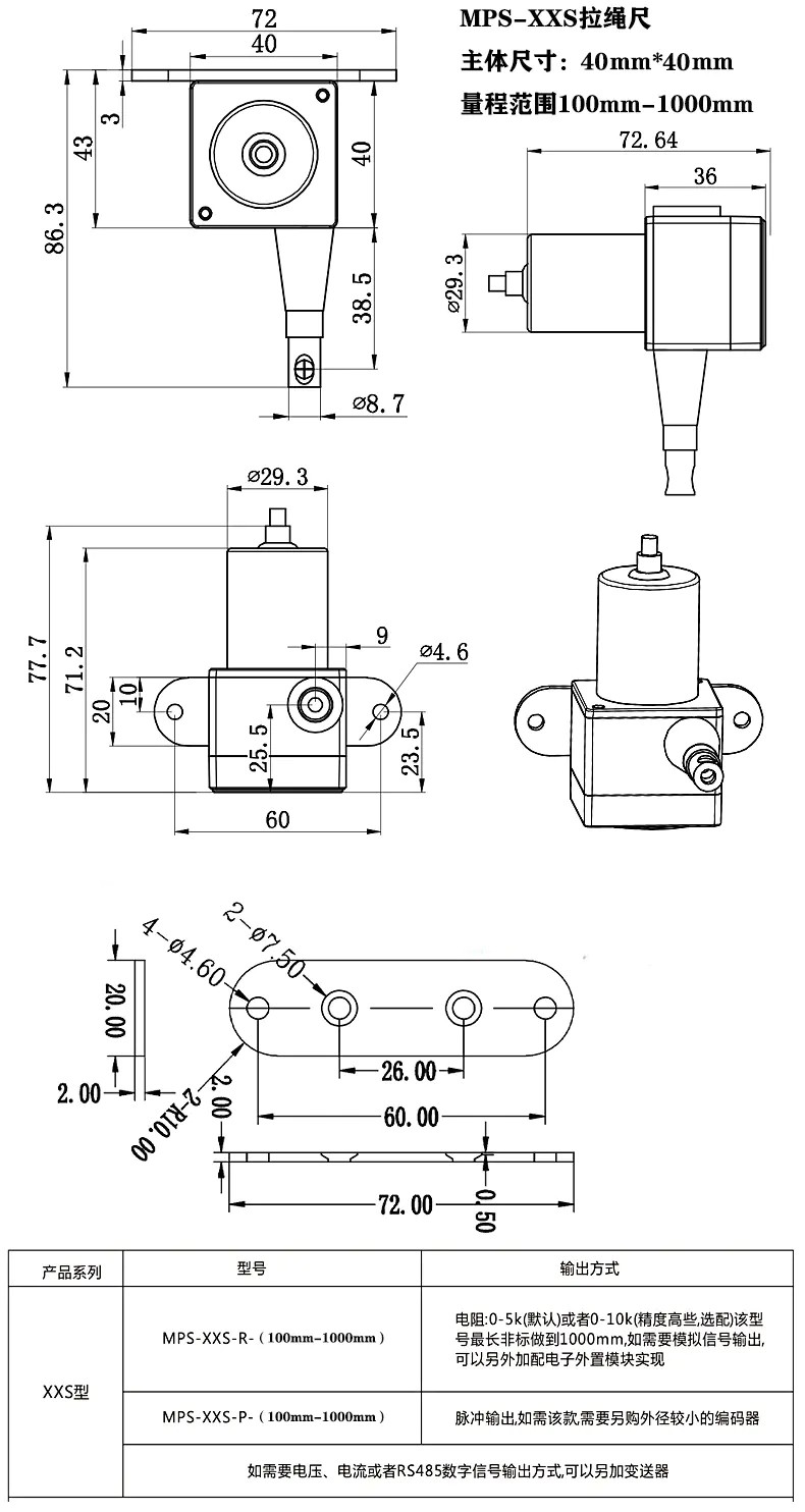 MPS-XXS拉線尺,又稱拉繩編碼器,拉繩尺,拉繩位移傳感器,拉線編碼器,拉線位移傳感器,是直線位移傳感器在結(jié)構(gòu)上的精巧集成,充分結(jié)合了角度傳感器和直線位移傳感器的優(yōu)點(diǎn),成為一款結(jié)構(gòu)緊湊、測(cè)量行程長(zhǎng)、安裝空間尺寸小、具有高精度測(cè)量的優(yōu)良傳感器。MPS-XXS拉線尺系列產(chǎn)品具有很大的選擇空間,行程從100mm至1000mm不等, 具有模擬電流信號(hào)mA:4-20mA,模擬電壓信號(hào)V1:0-5V,V2:0-10V和脈沖信號(hào)P:A、B、Z相數(shù)字輸出,RS485數(shù)字信號(hào)輸出。滿足大行程、高精度各種信號(hào)需求。