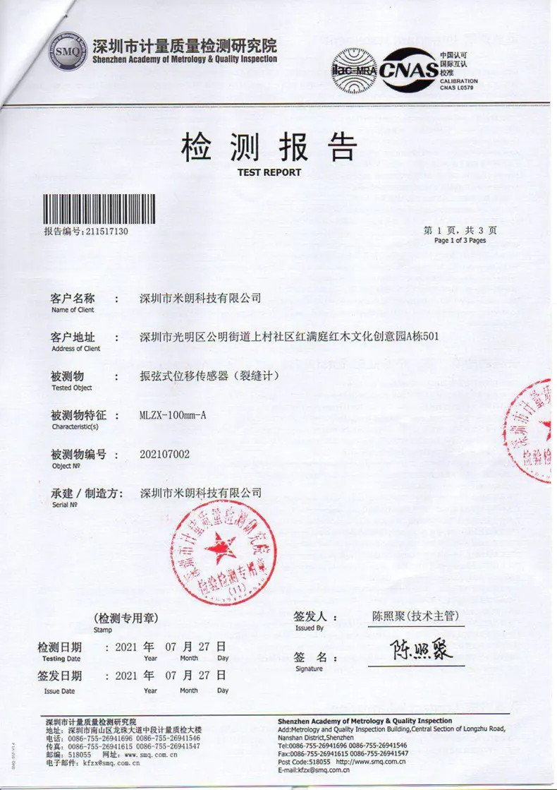 七、振弦式表面裂縫計(位移傳感器)檢測報告: