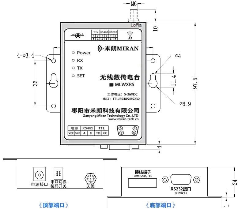 ⑥: 面板LED指示燈,POWER電源指示燈,上電就亮。數據收發RX,TX指示燈。無線收到數據RX閃爍,無線發送數據TX閃爍。SET接口設置燈紅藍都亮表示MAX485接口,紅燈亮表示TTL接口,藍燈亮表示MAX232接口。