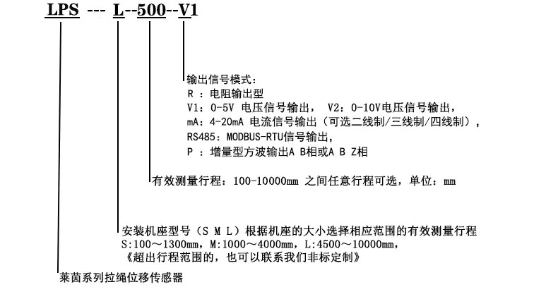 該系列產品具有很大的選擇空間,行程從100mm至10000mm不等, 具有模擬電流信號mA:4-20mA,模擬電壓信號V1:0-5V,V2:0-10V,脈沖信號P:A、B、Z相數字輸出,RS485數字信號輸出等;滿足大行程、高精度各種信號需求。