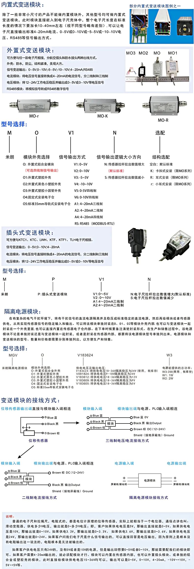 如果供電電壓只有24V的,沒有5V或者是10V的電源,但是輸出卻想要0-5V或者0-10V,那就需要配我們的模塊即可。如果需要4-20MA或者RS485輸出的,就必須配模塊才行。模塊可以內置在傳感器內部,也可以外置插頭模塊(限模擬量信號輸出)、或單獨的鋁合金或塑膠殼的模塊。