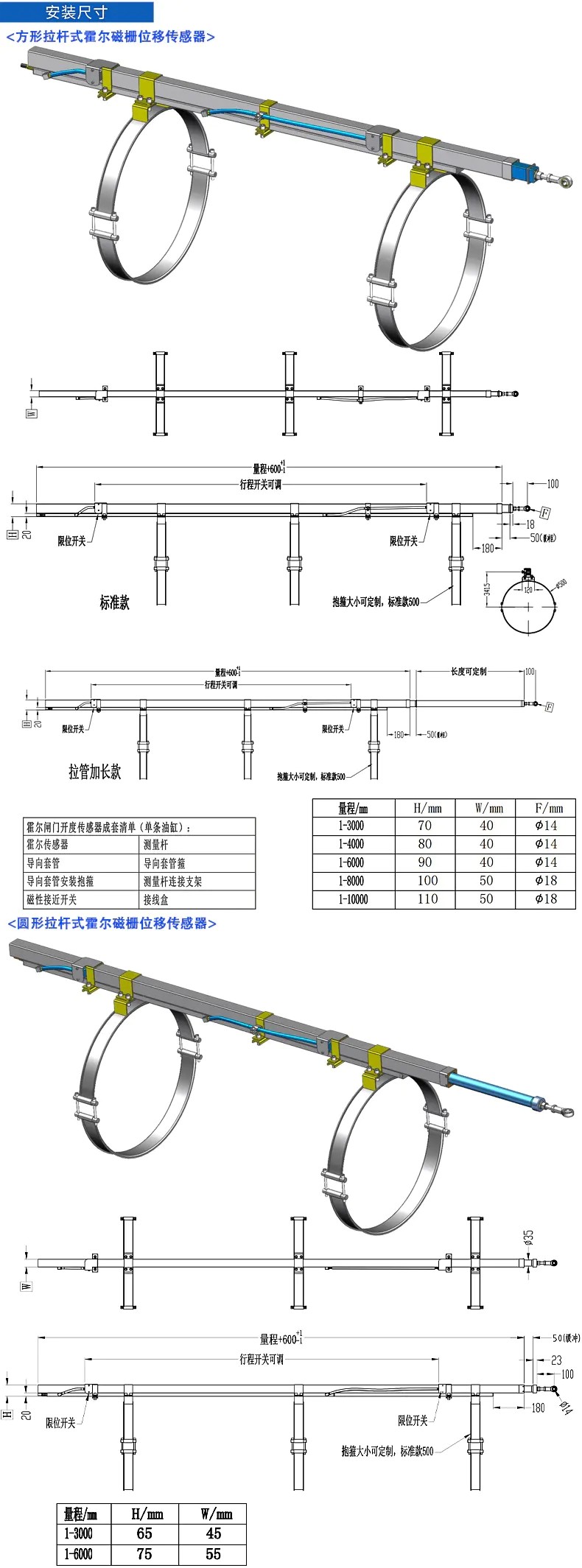 三、閘門開度(霍爾磁柵)位移傳感器技術(shù)參數(shù)及安裝尺寸: