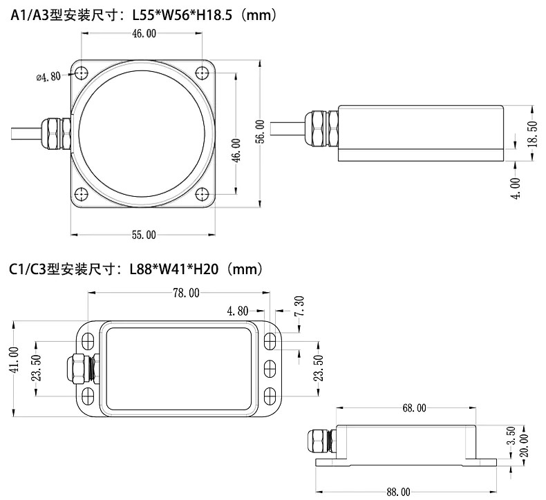 四、六軸(姿態)傾角(動態)傳感器安裝尺寸: