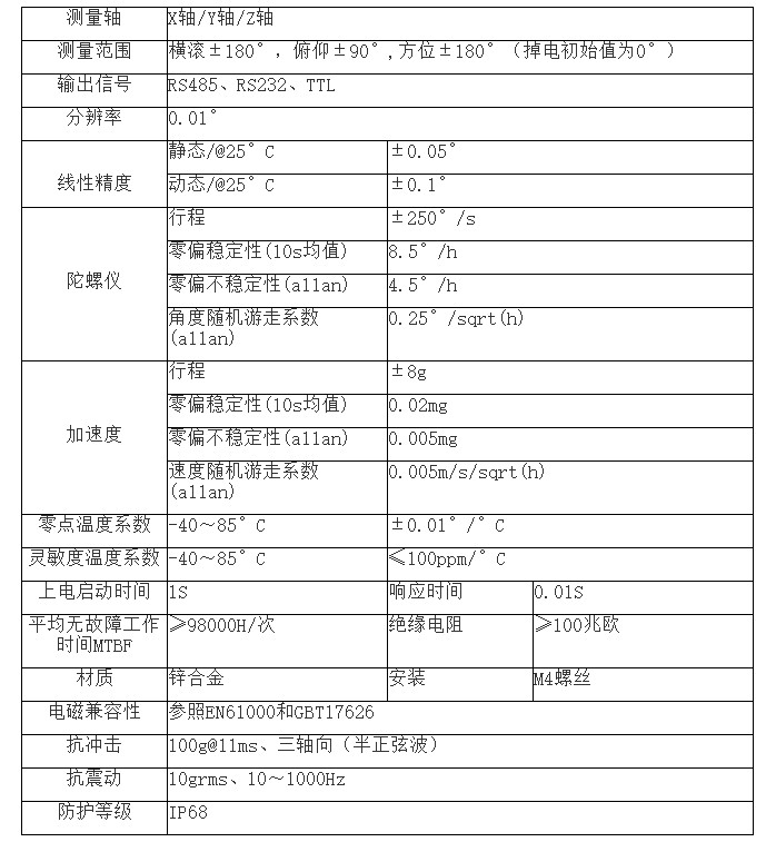 三、六軸(姿態)傾角(動態)傳感器技術參數: