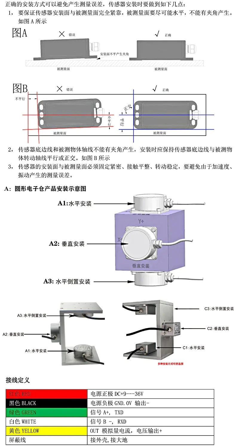 三、傾角傳感器安裝方法與接線方式: